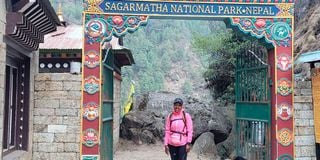Grace Kinyua, an IT project manager at the entrance of Sagarmatha National Park, Nepal, home to Mount Everest, the highest peak in the world.