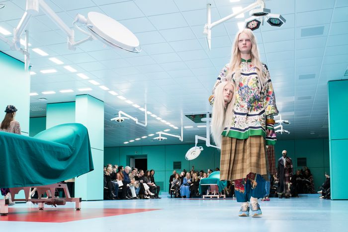 A model walks the runway at the Gucci show during 2018 Milan Fashion Week