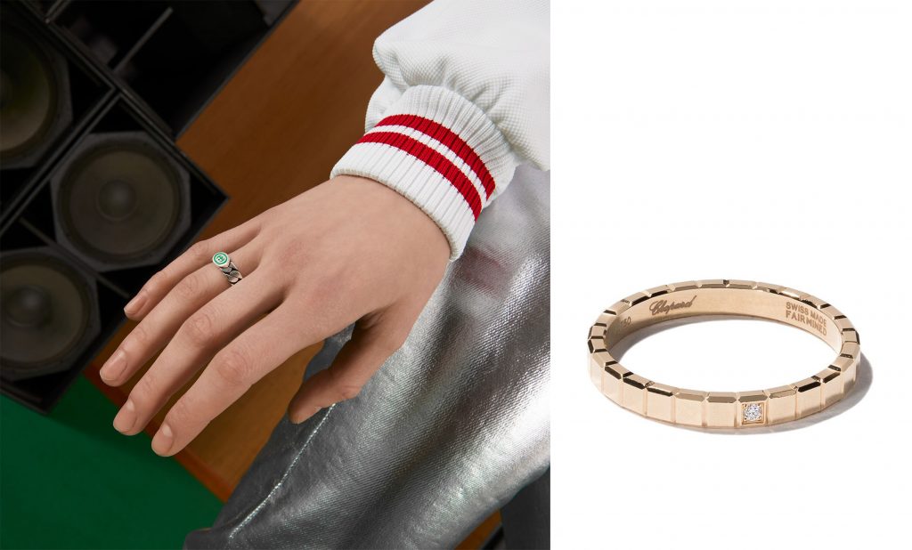 Gucci’s Interlocking G enamel ring (left) and Chopard’s Ice Cube 18K gold ring (right) are among the hot-selling jewelry items this Singles’ Day. Photo: Gucci, Chopard