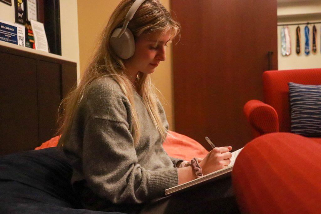 Junior Ellie Torgerson winds down the evening with journaling and music in the HAWC on Feb. 25. She shared how calming practices are an essential part of ending her day. Photos by Denver Patterson