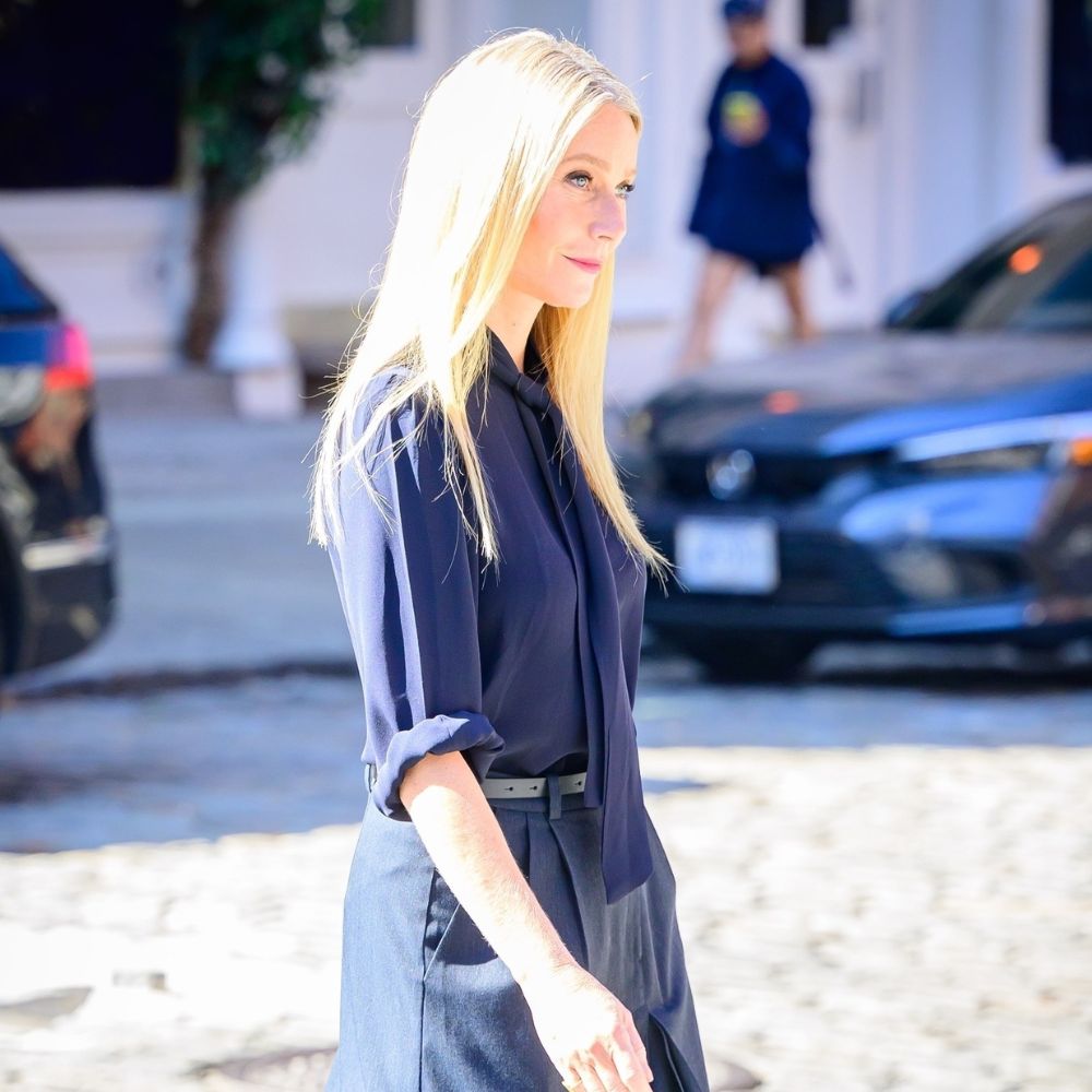 While gearing up for a day of filming in New York, Gwyneth Paltrow emerged in an undeniably timeless and typically elegant outfit that was also steeped in some of fashion’s favorite new trends.