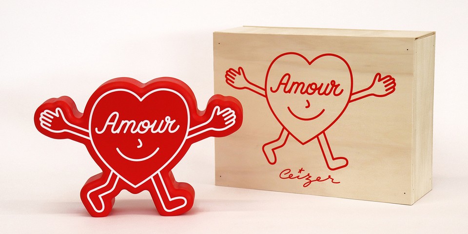 Hand-crafted in Ceizer’s Paris atelier, Amour is a humanoid heart with outstretched arms and legs and its tagline painted directly across its visage. It’s doused in vivacious red and equipped with white screen-printed details that highlight the Dutch-born artist’s mono-line style, beautiful in its intentional simplicity. Each sculpture stands roughly 10 inches tall, is signed and numbered on the bottom of its feet and comes in a custom wooden box.
