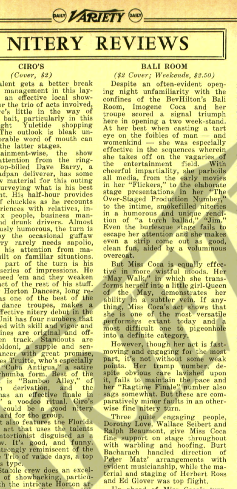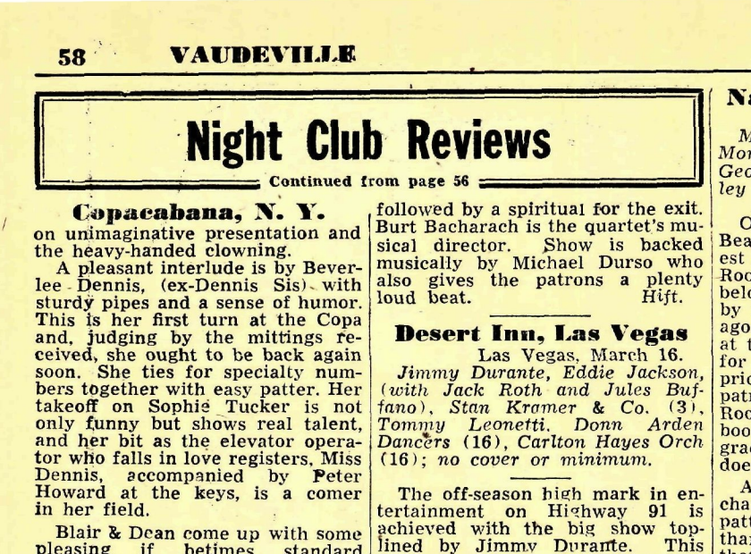 More than a year later, Bacharach got a little bit more ink in a review of Imogene Coco’s cabaret show at the Beverly Hilton’s Bali Room. “Burt Bacharach handled direction of Peter Matz’ arrangements with evident musicianship,” as our reviewer observed in the Dec. 5, 1955, edition of Daily.