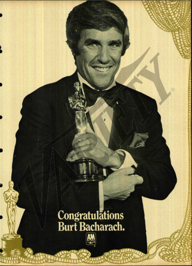 Hot as Bacharach and David were at that time, the pair were destined for even greater heights in 1969 with their work on George Roy Hill’s “Butch Cassidy and the Sundance Kid.” You couldn’t escape the song “Raindrops Keep Fallin’ on My Head” by B.J. Thomas, and it was certainly a rainmaker for Bacharach and David. The two won the Oscar for original song, and Bacharach claimed a second Academy Award for the film’s original score, as lauded in a congrats ad from A&M in the April 13, 1970, edition of weekly.