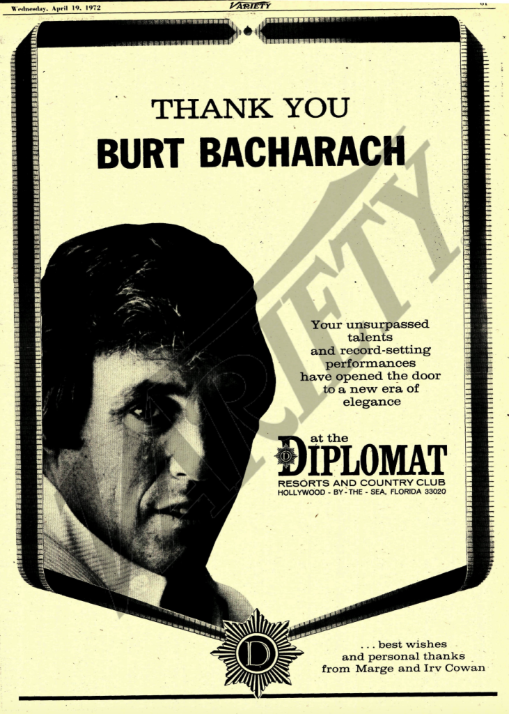What shines through in his many mentions in Variety is how much Bacharach clearly loved to work – as a composer, arranger, musician, producer and singer. In 1972, at the top of his game, Bacharach was saluted in an ad in the April 19 edition of weekly that featured a “personal thanks” from Marge and Irv Cowan for the record-setting returns he delivered with his stint performing at Diplomat Resorts and Country Club in Hollywood, Fla.
