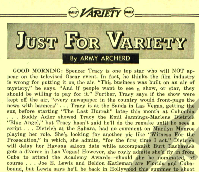 Two years later, in January 1958, Bacharach was working with Marlene Dietrich as part of her stage show at the Sahara in Las Vegas. She must’ve really liked him because she decided to delay her “Havana saloon date” while Bacharach got himself un-hitched in Sin City, as Army Archerd reported in his “Just for Variety” column in the Feb. 4, 1958, edition of Daily.