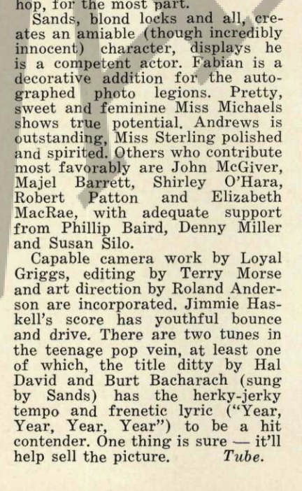 By 1961, Bacharach and David were getting into the movie business, writing the title track to the Fabian-Tommy Sands starrer “Love in a Goldfish Bowl.” “There are two tunes in the teenage pop vein, at least one of which, the title ditty by Hal David and Burt Bacharach (sung by Sands) has the herky-jerky tempo and frenetic lyric (“Year, Year, Year”) to be a hit contender. One thing is sure – it’ll help sell the picture,” we wrote in the review in the June 2, 1961, edition of Daily.