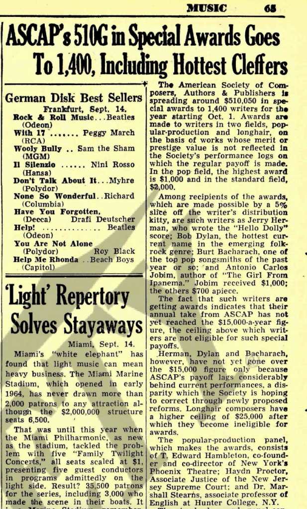 Fast forward two years and Bacharach was winning cash from ASCAP for his success. He was in good company, picking up a $700 prize alongside Broadway legend Jerry Herman, bossa nova pioneer Antonio Carlos Jobim and Bob Dylan, who we described as “the hottest current name in the emerging folk-rock genre” in the Sept. 15, 1965, edition of weekly.
