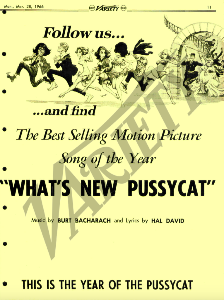 Whoa, whoa, whoa – it’s obvious from the pages of Variety that Bacharach’s career hit a new level with the success of the song “What’s New Pussycat” from the 1965 Peter Sellars-Peter O’Toole comedy of the same name. Nor did it hurt the career of Tom Jones, the charismatic Welshman who sang it for the film’s soundtrack.