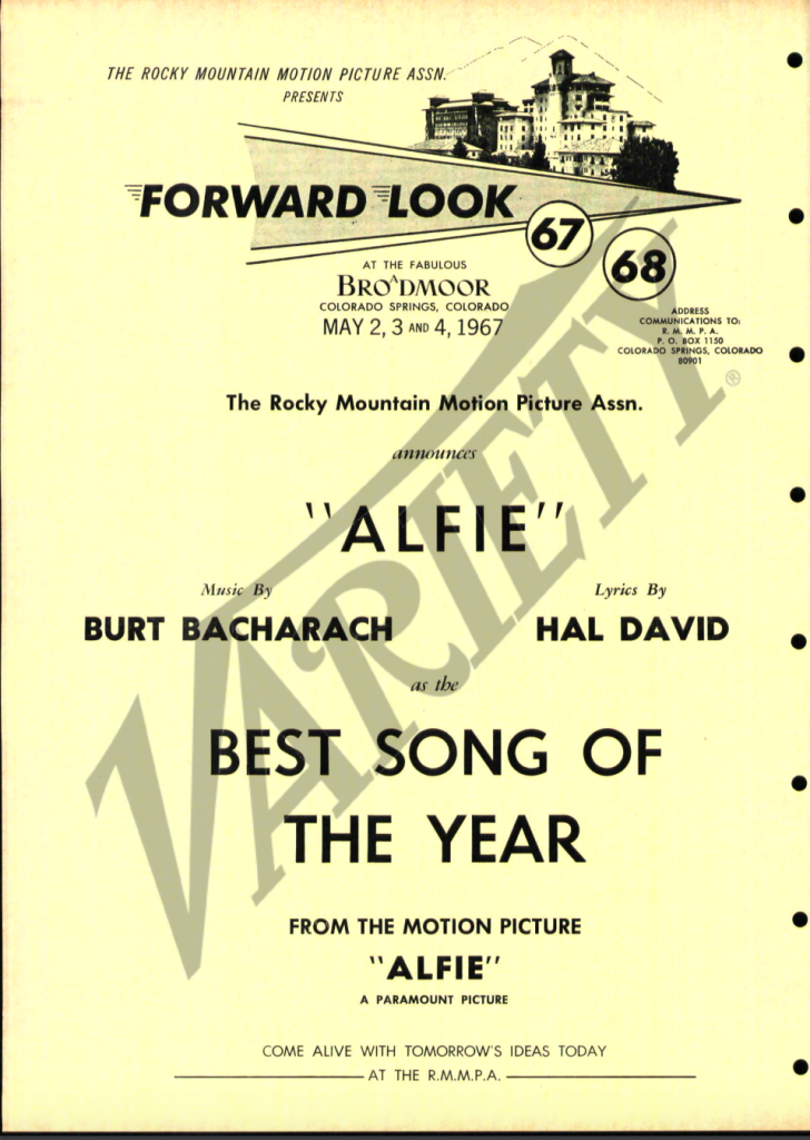 From there, Bacharach and David had a run of hits that captured the 1960s zeitgeist and rivaled the chart success of Lennon and McCartney, including “Alfie,” from the 1966 Michael Caine starrer of the same name. In fact, what it was all about was acclaim for Bacharach and David, including a hat-tip from the Rocky Mountain Motion Picture Assn., which let the showbiz world know by taking a page in the March 22, 1967, edition of Daily.