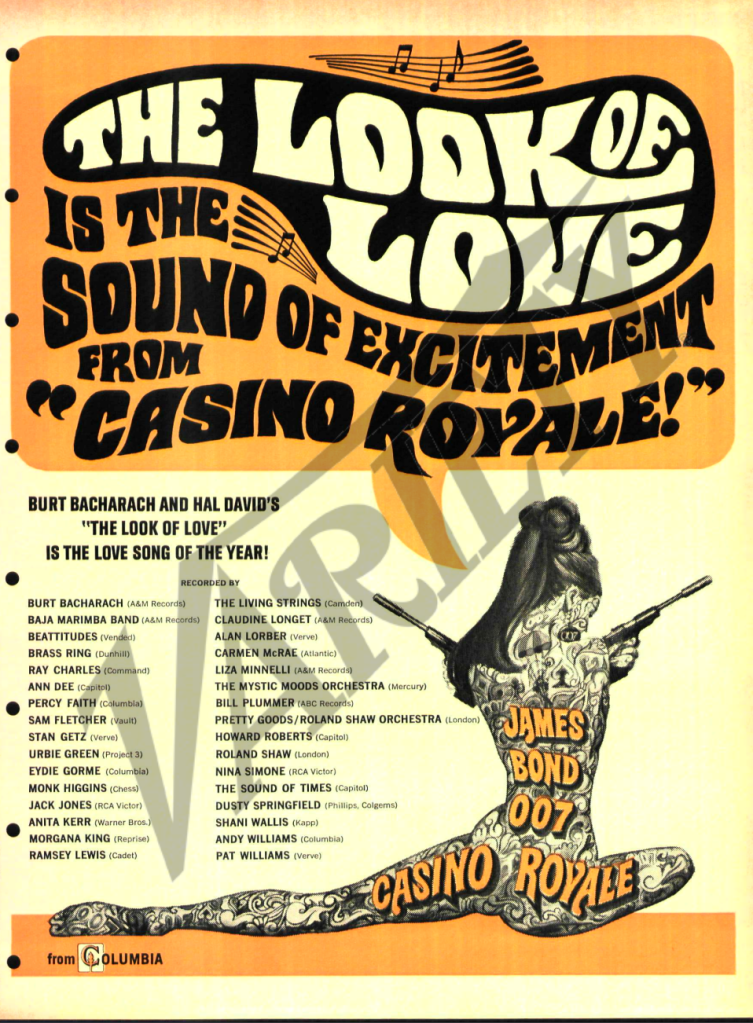 “The Look of Love” from 1967’s “Casino Royale” was another smash – and just look at the range of artists who covered the tune in a short time. The list runs the gamut of Nina Simone, Stan Getz, Liza Minnelli, Dusty Springfield and the Mystic Moods Orchestra.
