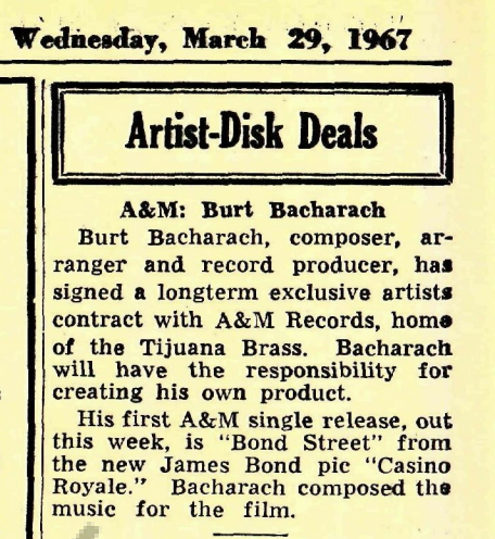The year 1967 was also a milestone for Bacharach because it marked his signing with A&M Records. The house that Herb Alpert and Jerry Moss built (on La Brea Avenue) would become Bacharach’s longtime label home, as we first reported in the March 29, 1967, edition of weekly.