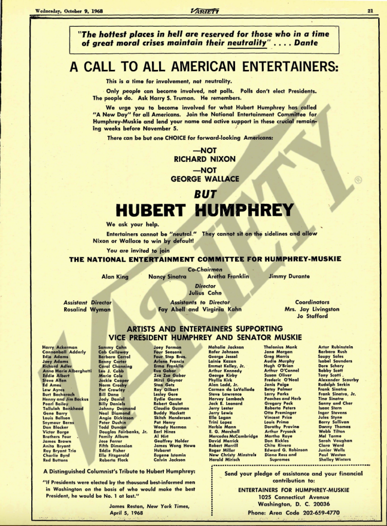 As his star skyrocketed, Bacharach did not ignore national politics. He was among the signatories to an ad declaring showbiz’s support for Hubert Humphrey’s 1968 presidential bid. The National Entertainment Committee for Humphrey-Muskie – co-chaired by no less than Alan King, Nancy Sinatra, Aretha Franklin and Jimmy Durante – declared their support for the Senator from Minnesota (and his running mate Edmund Muskie) in a full-page ad in the Oct. 9, 1968, edition of weekly.