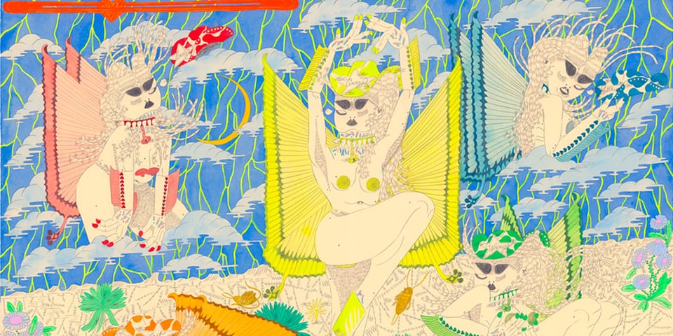 Born and raised in Queens, much of Benjamin’s art is self-referential. Her forms are often exaggerated and draw on both her lived experiences, as well as early influences, such as Sailor Moon to the work of Henry Darger. “I want my work to hold all of these intense, conflicting emotions at the same time, because that’s how I feel,” Benjamin previously told Hypeart. “Creating a painting of a woman covered in scratches to me is about the pain of self harm inflicted because she’s so upset with her physical form, but in that same image she’s horny and surrounded by beautiful flowers, it isn’t all bad and she knows that even in the darkest moments.”