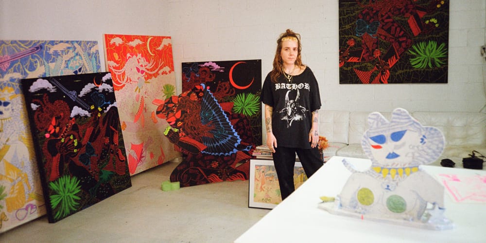 For NADA Miami 2023, Olympia is presenting the latest creations from rising contemporary artist Heather Benjamin. Benjamin’s art delves into surreal self-representation, featuring avatars ranging from female warriors to cowgirls, fairies, and sphinxes, all navigating a cosmic desert adorned with psychedelic plants and illuminated by electric storms in its perpetual night.