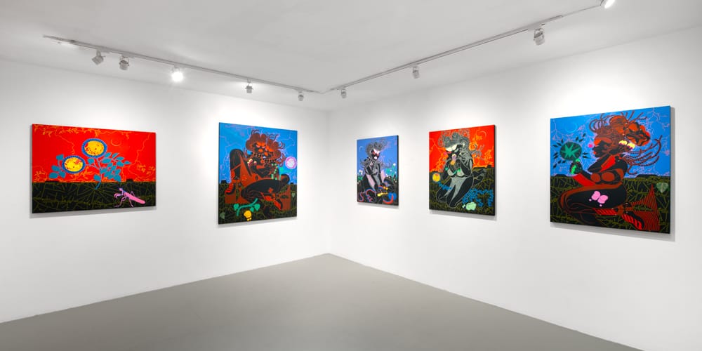 Her figures, part deity and part drifter, navigate barren worlds where strange flowers thrive under electric skies. These blooms, both real and symbolic, represent resilience in harsh environments. Inspired by Surrealism and outsider art, Benjamin’s work mixes the raw and the fantastical: floating lovers, cryptic phrases on cowboy hats and butterflies emerging from shattered mirrors.