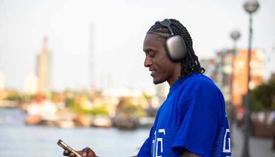 One young man listening to music on headphones and checking a smart phone in the city by a river at twilight