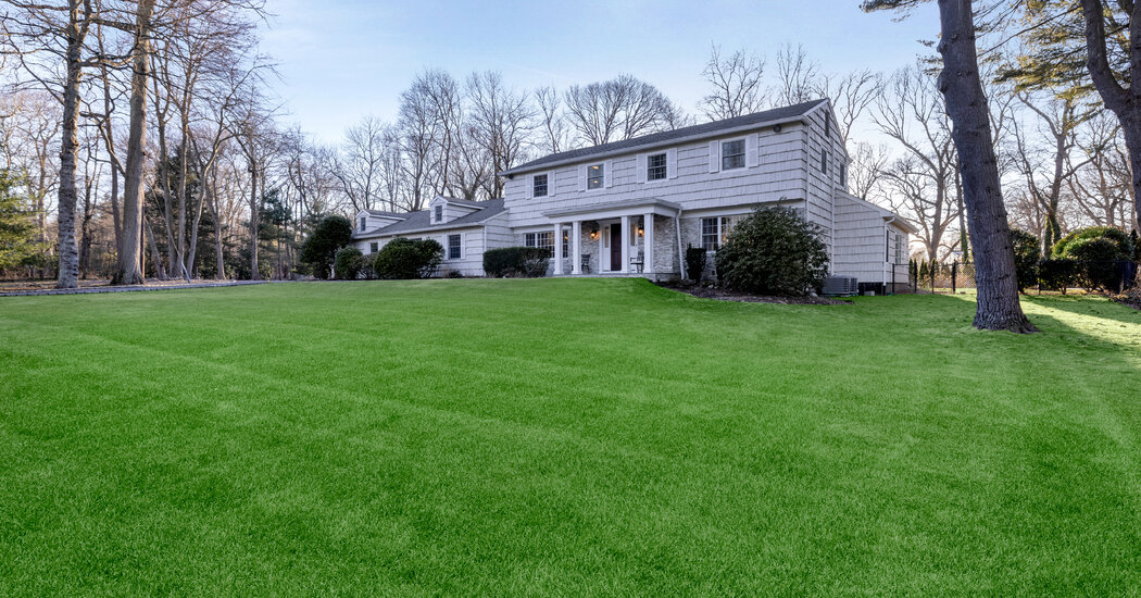A six-bedroom, three-and-a-half-bath, renovated 1964 home with hardwood and radiant-heat travertine floors; a large, bright formal living room; a sunken family room with tall tray ceilings and a double-sided stone wood-burning fireplace; an informal dining room with peg hardwood floors and a coffered ceiling; a kitchen with marble countertops, an island, a farm sink, custom cabinetry, a pass-through window and sliding doors to a patio; an en suite primary bedroom with a large walk-in closet, bathroom with double vanity and jetted shower; and an attached three-car attached garage, on 2.29 acres. Maria Babaev, 516-287-7716; Douglas Elliman; elliman.com