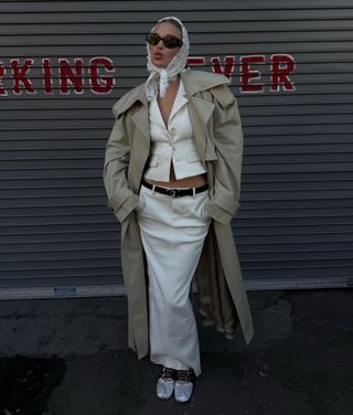 Style Notes: With warm weather and clear skies comes the ballet flats revival, and I couldn’t be more excited for this to get underway. Styling a metallic silver pair from Miu Miu, the model wore hers with a long-line pencil skirt and a sweeping trench. The result? A highly chich ensemble that was well equipped for spring’s warmer days.