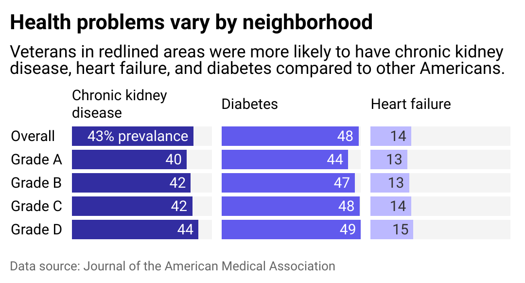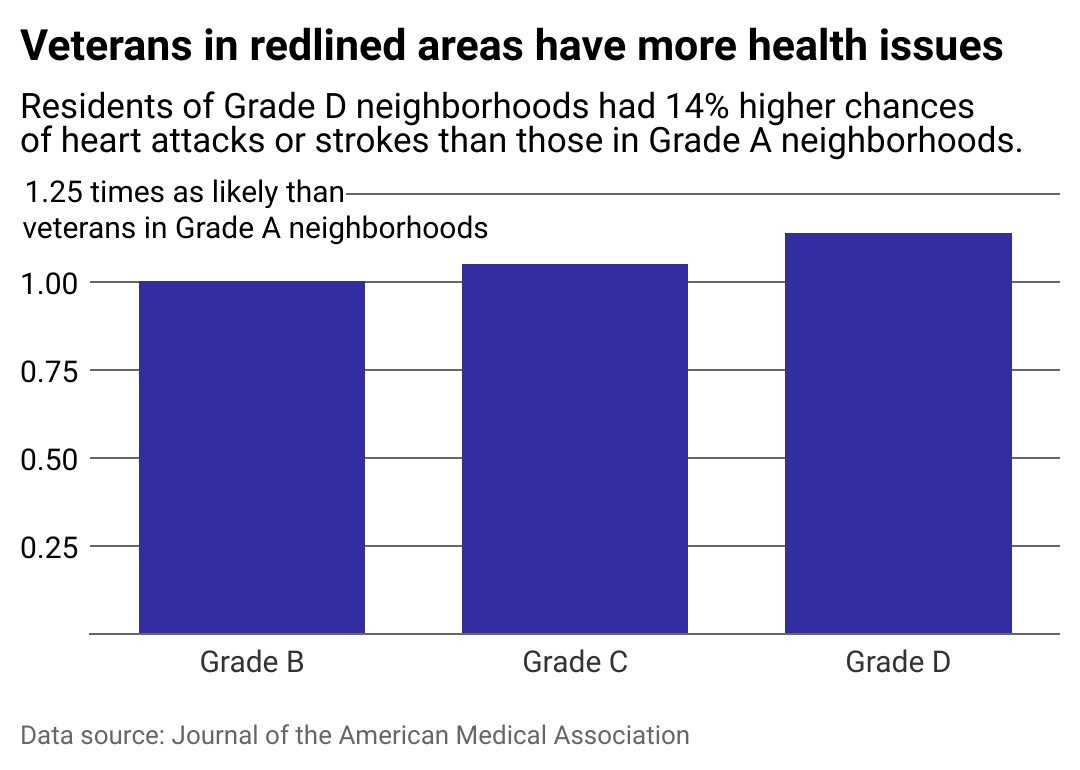 A study published in the Journal of the American Medical Association in May 2023 found veterans living in redlined areas are 14% more likely to have a major heart attack or stroke than people living in higher-graded areas. The study tracked long-term health outcomes among veterans over a four-year period but was adjusted for demographic factors such as race and gender.