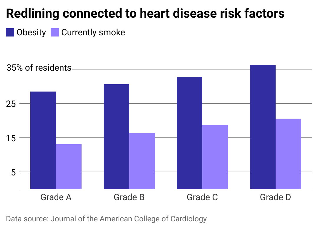 People who live in redlined areas are more likely to deal with risk factors for heart diseases, including obesity and smoking, though that is largely by design.