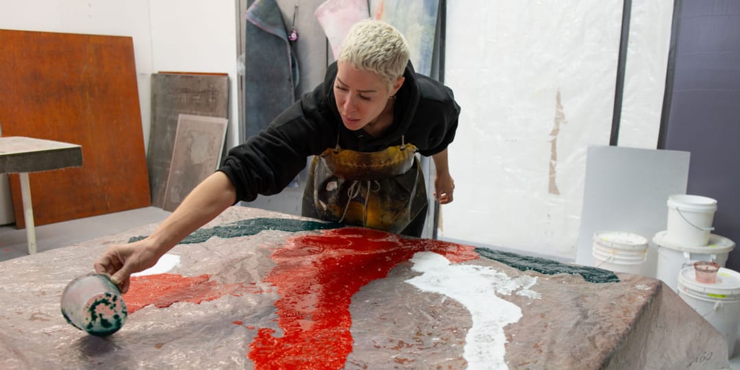The technique that really got me where I wanted to go didn’t come until the end of my time there. I was having trouble getting the right hues and saturation, so as soon as I did my first press, I’d pour pigment directly onto the papers. Throughout my career, pouring has been such a big part of my discovery process. A lot of that was from my own painting practice, but I was also thinking about Helen Frankenthaler and her pours – how revolutionary they were to abstract painting, their simplicity and power. They became a really nice compositional grounding for how I approached the transfers.