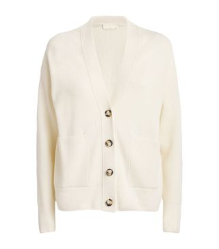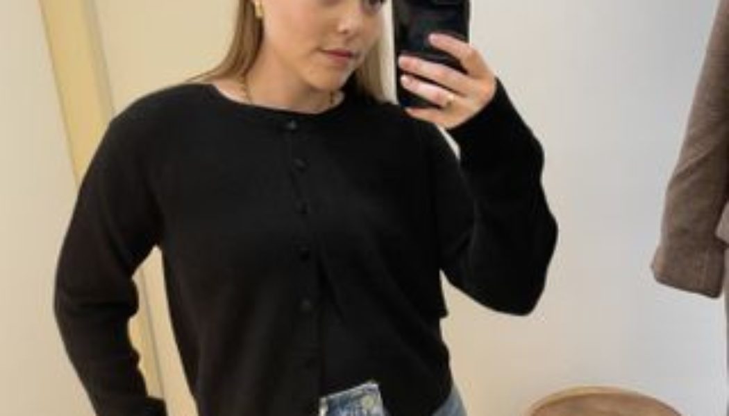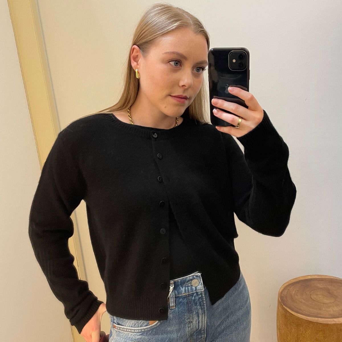 Florrie wears the Reformation Clara Cashmere Cardigan in size M (was £198, now £149)