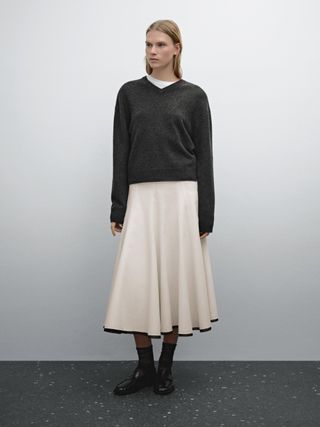 Whilst this skirt naturally pairs well with slim-fitting shirts for a sleek finish, I find myself drawn to a more-is-more approach—think square-shaped jackets, oversized knits and plenty of texture.