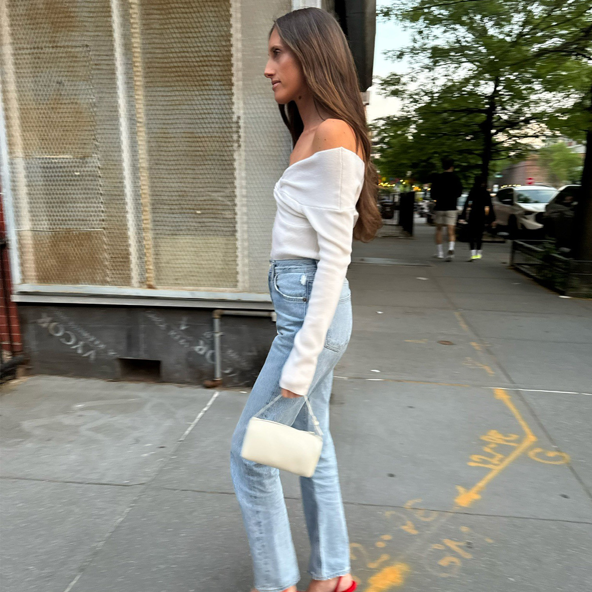 “My favorite jeans for the evening are my Agolde Lana jeans. I have all washes. They are the perfect straight leg and work with all heel heights, so they are great for casual dinners and more of a night out, too, with a higher heel. I love this wash in summertime with a fun color-pop sandal and in fall or winter paired with black footwear.”