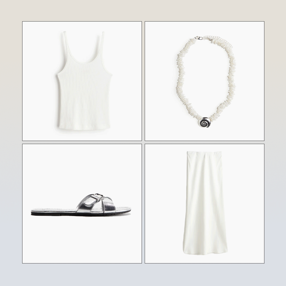 Simple and chic, nothing says easy summer dressing like a crisp white linen maxi skirt and a white tank top. Silver accessories make for a fashion-forward finishing touch.