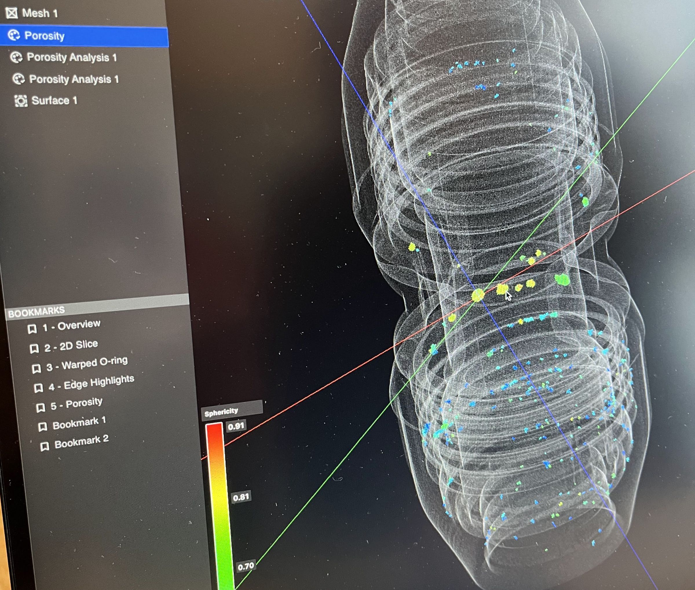 With a CT scanner, there’s no need to cut: you can spin, zoom, and go slice by digital slice to see what’s wrong. Lumafield’s web interface lets you measure distance with just a couple clicks, and the company sells a flaw detection add-on that automatically finds tiny hollow areas in an object — known as porosity; it’s looking for pores — which could potentially turn into cracks down the road.