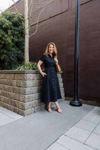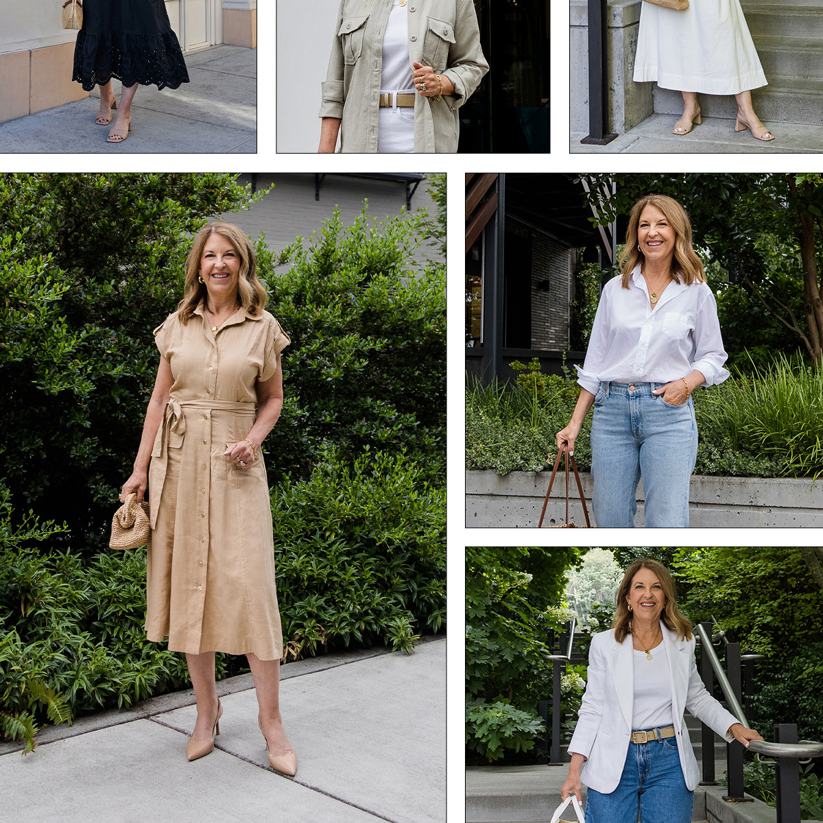 Assembling chic outfits is Sandy Koszarek’s specialty. After all, she spent decades as a VIP stylist and Nordstrom and currently highlights her enviable ensembles on her Instagram and site, Stylish Sandy. Jeans and dresses are two pieces that she, like many out there, wear on repeat. So we thought there could be interest in learning more about how she styles these must-haves. Specifically, we wanted to focus on the shoe silhouettes she thinks work perfectly with dresses and jeans because of their versatility.