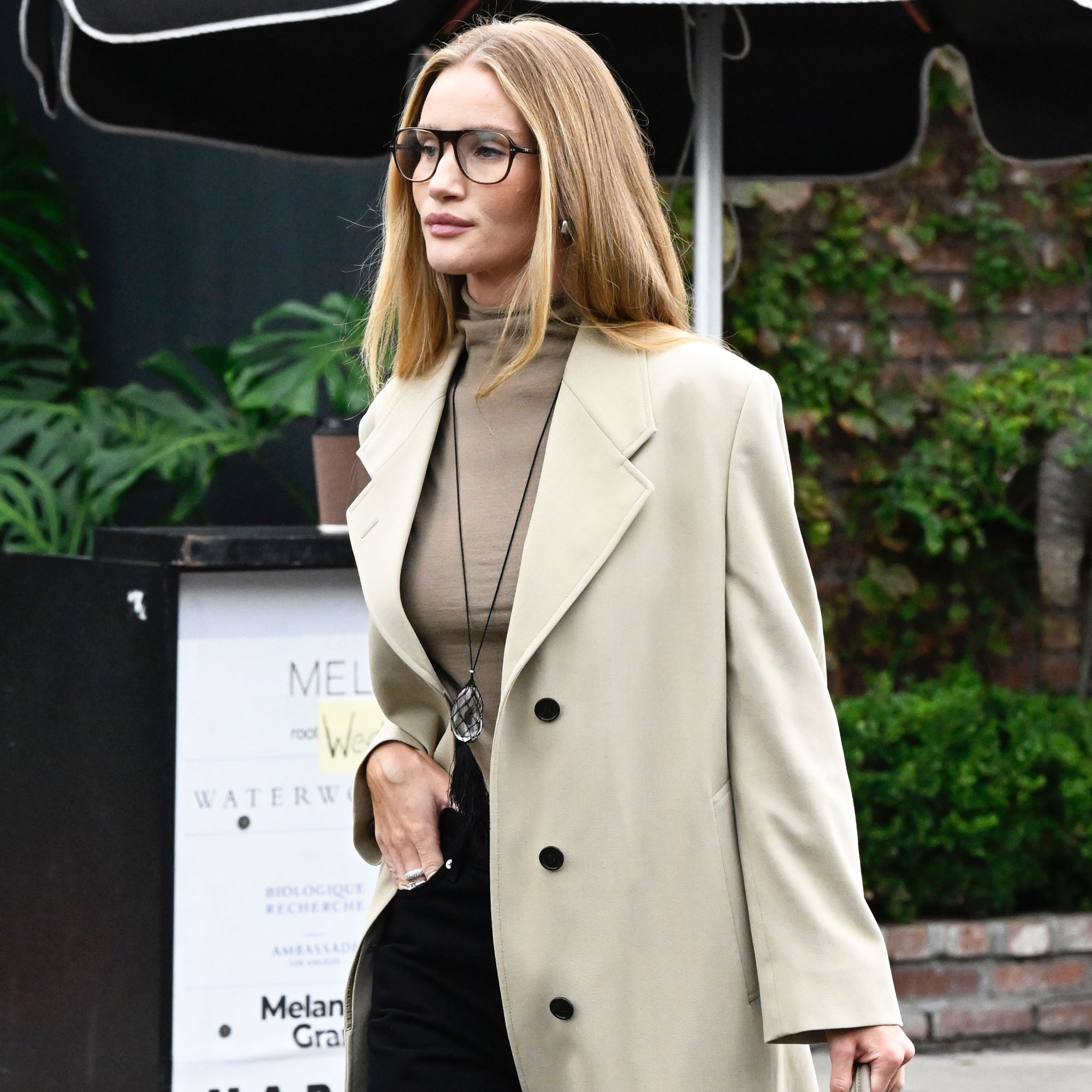 On Rosie Huntington-Whiteley: The Row bag, coat, top, and shoes; Same jeans