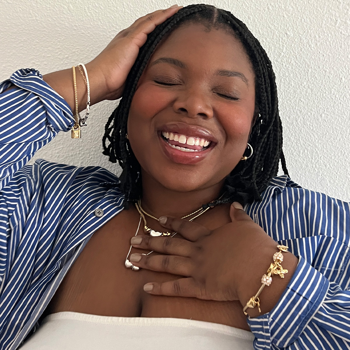 “Maybe it’s my Leo rising showing up and showing out, but I absolutely love when I get compliments on my jewelry, and that usually happens with the bolder styles. I am a firm believer in the power of jewelry and accessories in general. Putting on your favorite pieces really adds personality and uniqueness to a look. It’s the difference between being a mannequin and a living human being. Pandora is such a key to adding life to a look—all of their pieces are so unique. Especially the BE LOVE charm. I can’t get over the puffy design. I’ve been so into the mixed metals trend, so I definitely knew I wanted to mix silver and gold from the get go. The Pandora pieces made mixing silver and gold so seamless. I’m such a fan of a big stack when it comes to my necklaces and bracelets. [The brand has] so many options for crafting the perfect stack, which makes it easy to wear the different pieces over and over again.” — Chichi Offor, associate editor, Who What Wear