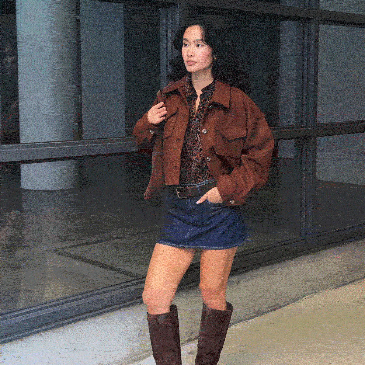 Suede and leopard print [have] been everywhere this fall season, and I love how [they] blended seamlessly for this outfit I’m wearing. I’ve also been gravitating toward mixing brown tones for my fall outfits, and I ended up pairing the brown tones with a dark denim skirt. My favorite part of the outfit [is] definitely the chocolate-brown suede boots. I think they’re so chic and easily elevate an outfit. I’ll be wearing this look for coffee runs, brunch with friends, and daytime dates.” — Cabatingan