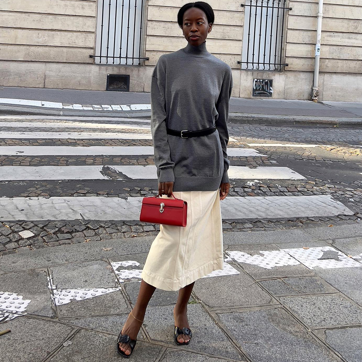 Since Prada’s F/W 23 runway show, gray sweaters with classic crewneck cuts and hems that fall right below the hip have been everywhere. Grab an affordable option from H&M and pair it with a belt, a full-length voluminous skirt, and pumps.