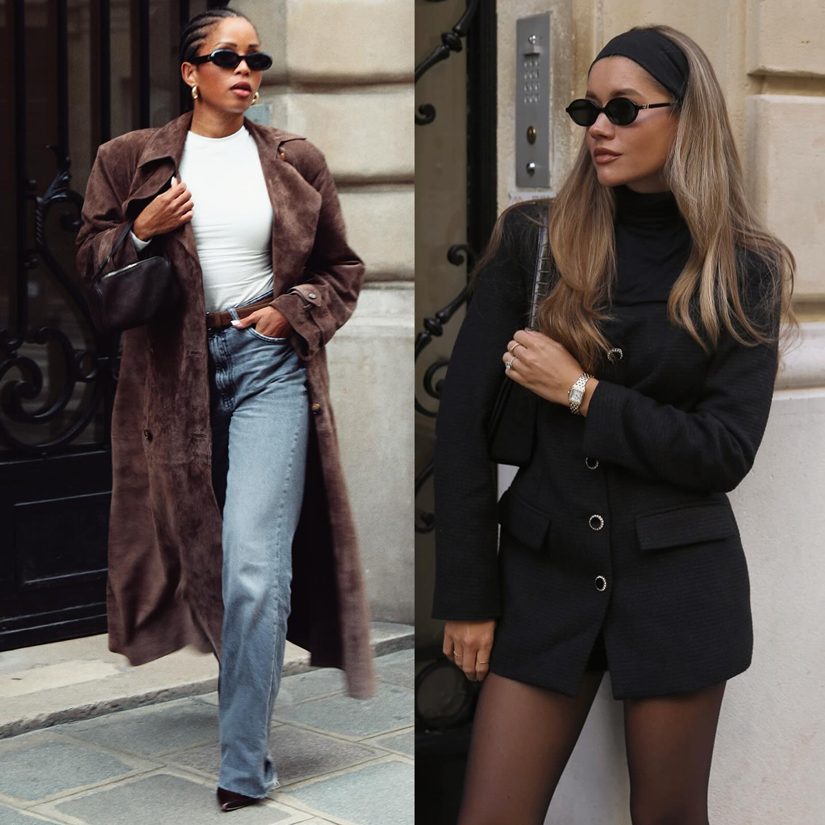 a photo of a woman on the sidewalk wearing a black stretchy headband, black sunglasses, a black turtleneck, a black blazer dress, black tights, and a silver watch