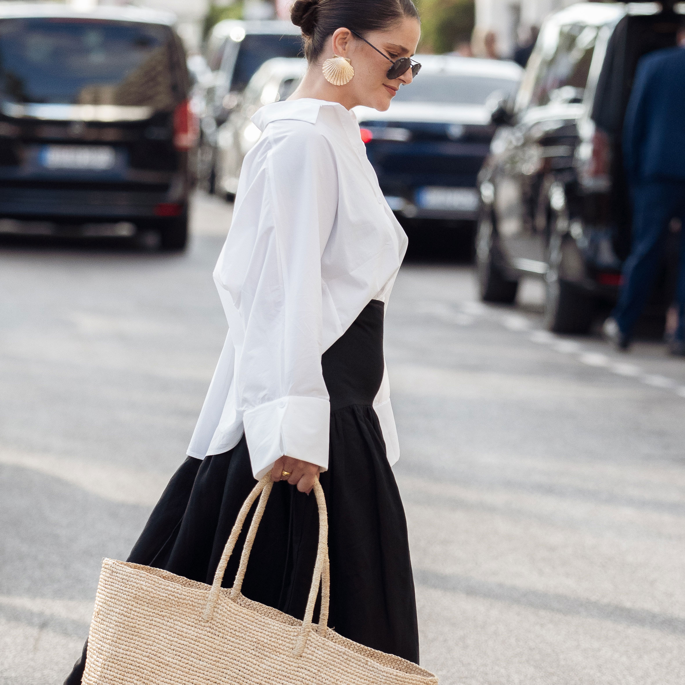 a woman wears a white shirt and a black skirt