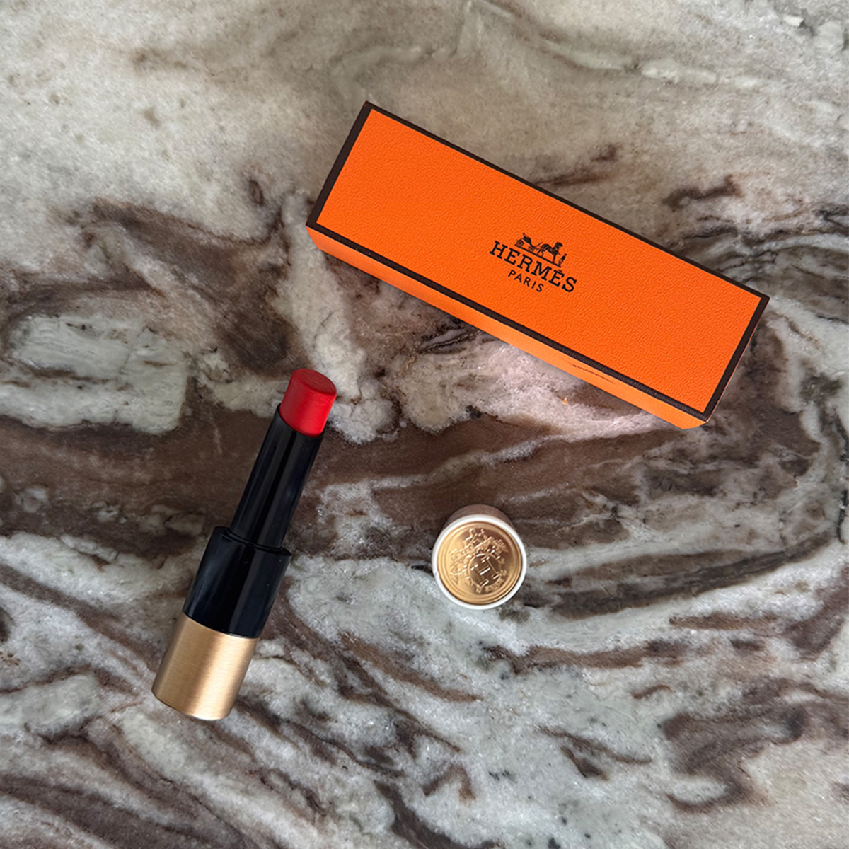 Let’s not pretend the packaging isn’t half the thrill here. Housed in a heavyweight tube with lacquered, minimalist colour blocks (mine: glossy black, creamy ivory and a glimmer of brushed gold. Other limited-edition shades have collectable, bolder colour-ways), it whispers:“If you know, you know.” It’s the kind of lipstick you’d nonchalantly whip out at an art gallery pretending you’re not low-key thrilled someone clocked it. It also comes housed in its own orange Hermès box, complete with a canvas pouch to protect your lipstick while on the go.