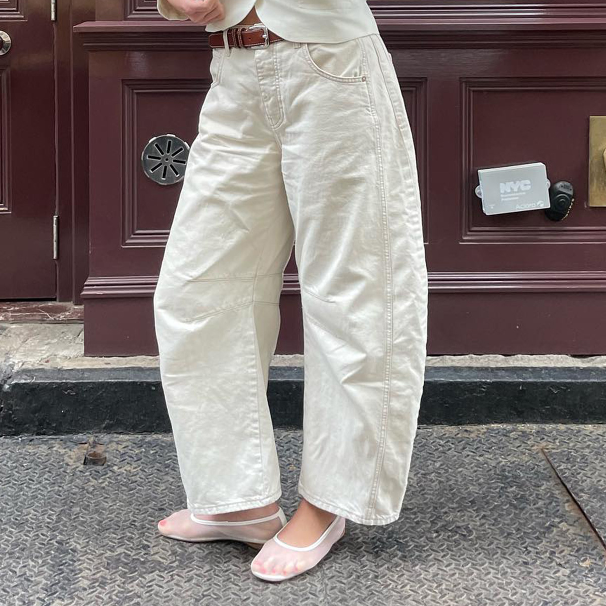 Anna Laplaca wearing barrel-leg jeans with white mesh flats.