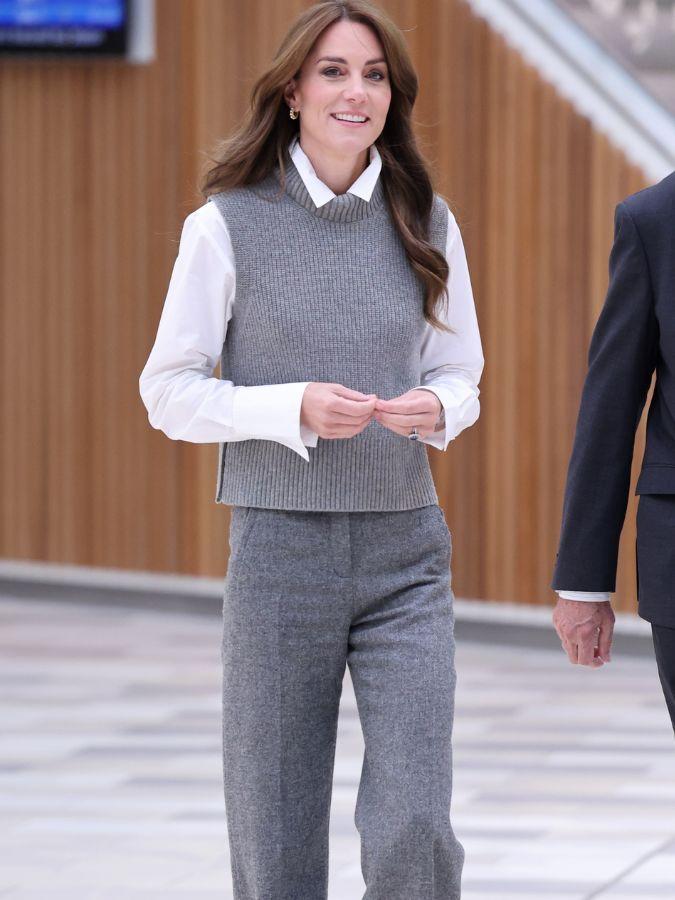 Catering to the early-autumn air, Middleton opted for a lighter take on autumn layering by styling a white button-down shirt worn underneath a grey roll- neck sweater vest. Spotted all across London this season. the layered knit vest has been our go-to whilst the weather remains balmy.