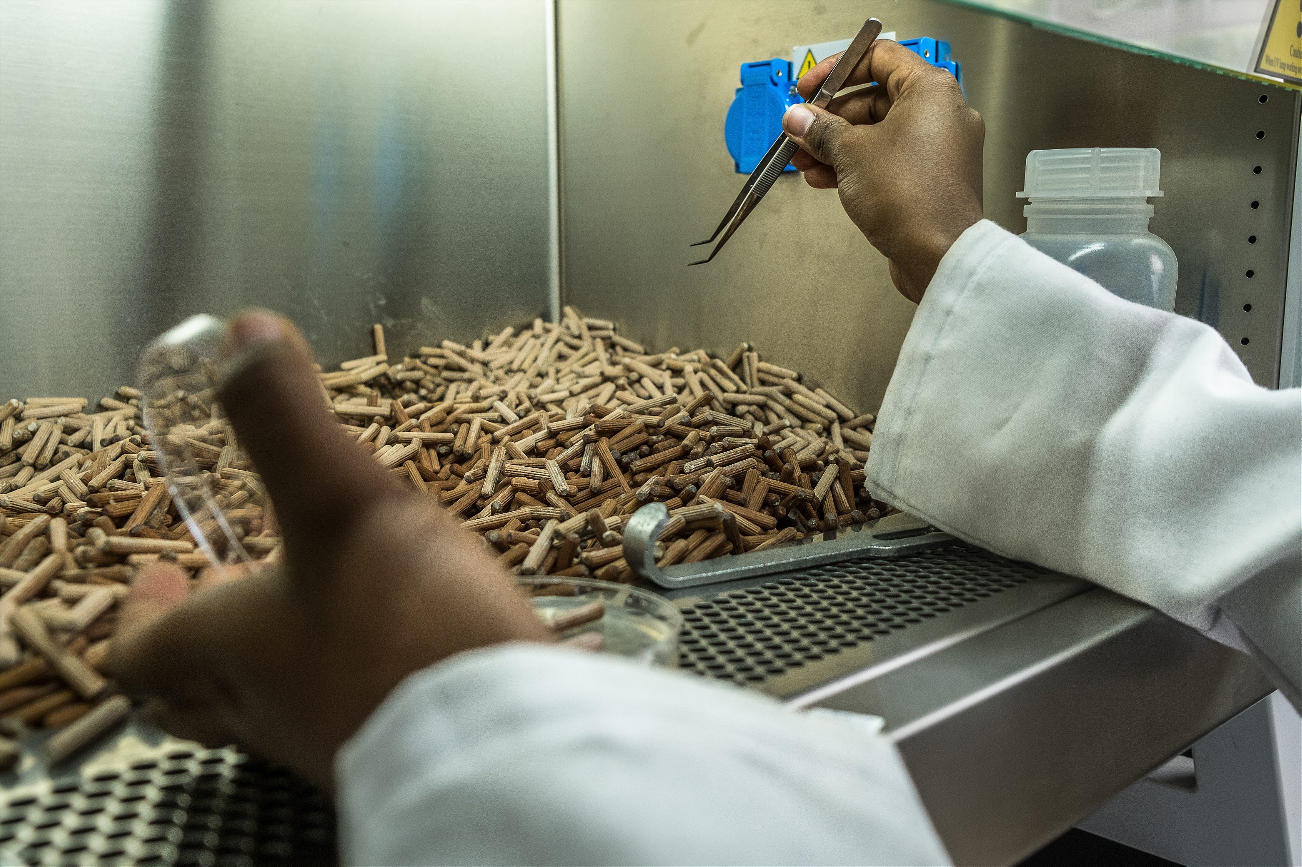 The challenge was developing a FOXY strain that would kill Striga but not its hosts. Sands’ first step was to find African scientists to lead the effort, a search that led him to Sila Nzioki, a plant pathologist at the Kenya Agricultural Livestock Research Organization. Together with Oyosi, Nzioki collected samples of wilted Striga in Maseno and found 17 different FOXY strains already in their roots. The Striga had succumbed to naturally occurring FOXY, killed by certain amino acids the fungus excreted. Nzioki and Sands identified which amino acids were deadly to Striga only and found a key trio—L-leucine, L-tyrosine, L-methionine—that they combined into FOXY-T14 (“T” for “trio,” 14 for 2014). This is the active ingredient in what would, after Kenyan regulatory approval, become The Toothpick Project’s commercially distributed product, Kichawi Kill.