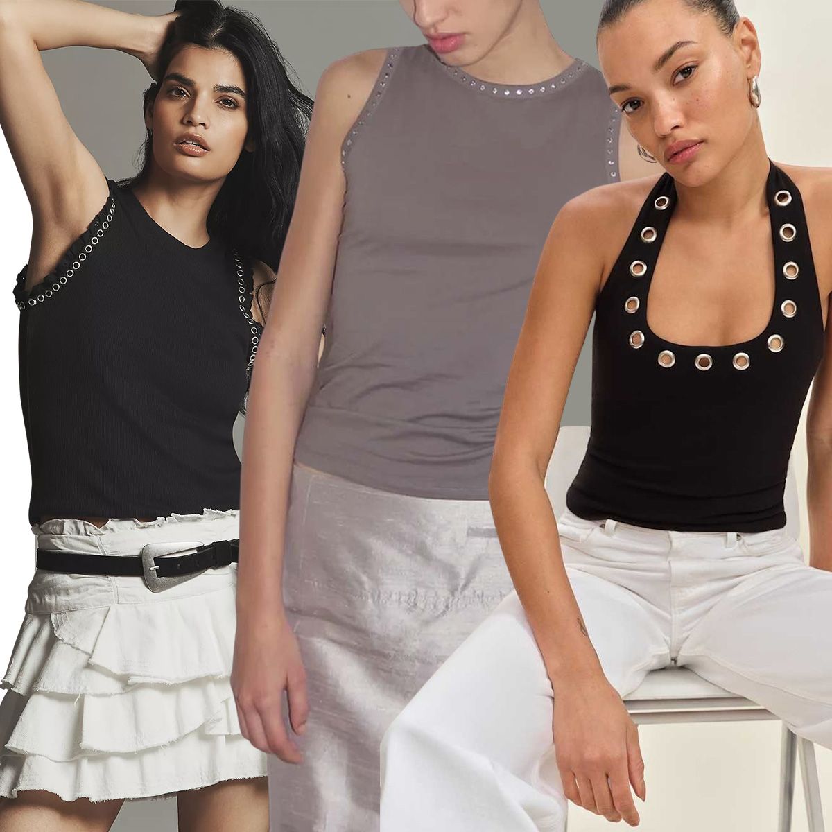 One thing I immediately noticed this summer was that all the women in Barcelona, Madrid, and the south of Spain were wearing studded tops. I’d assume the trend started with the Spanish brand Gimaguas’s studded bandana top, which sold out so quickly. The brand even made Rosalía a custom one in red to wear in the music video for her song “Omega.”