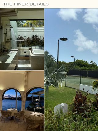 The property boasts beautiful grass tennis courts set alongside the lush foliage, where group or private lessons can be booked. The rooms are outfitted with fluffy robes and slippers, and mine also had a brightly lit bathroom with marble countertops. There are also multiple restaurants to dine at on the property. Breakfast was served each morning at Pimms, which has sweeping views of the property. Cip’s by Cipriani was a standout spot for dinner and has a local-inspired menu, as well as iconic favorites including the Harry’s Bar classic meringue cake. A personal favorite was The Cap Shack—the most casual of the options. I grabbed lunch here daily and ordered local crayfish that was cooked to order on the barbecue on the beach.