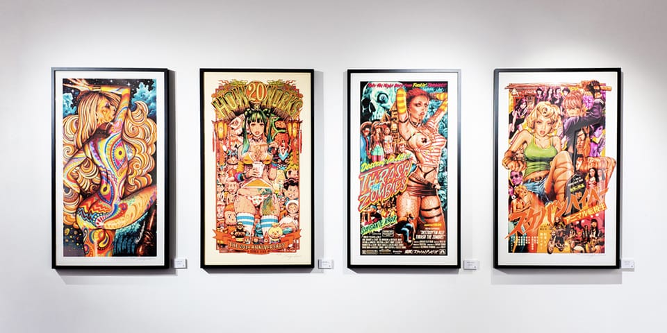 Known for his Playboy-like artistic approach, as well as frequent depictions of scantily clad women and monsters, the latest exhibition will not disappoint any of Rockin’ Jelly Bean’s loyal fans. The show houses a total of 45 giclee prints, alongside 14 original drawings comprising both old, new, and out-of-print pieces. Aside from the artwork, a small selection of EROSTIKA posters, T-shirts, stickers, and skateboards are offered in the gift shop corner of the gallery. Attired in his signature stripey suit and extravagant Luchador mask, the artist was accompanied by his mascots, the Jelly Bean Girls at the exhibition preview.