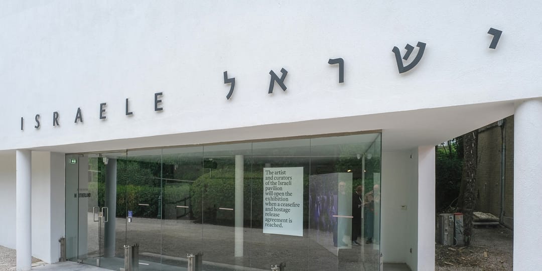 “The artist and curators of the Israeli pavilion will open the exhibition when a cease-fire and hostage release agreement is reached,” reads a sign on the window of the Israel national pavilion, where (M)otherland is housed.
