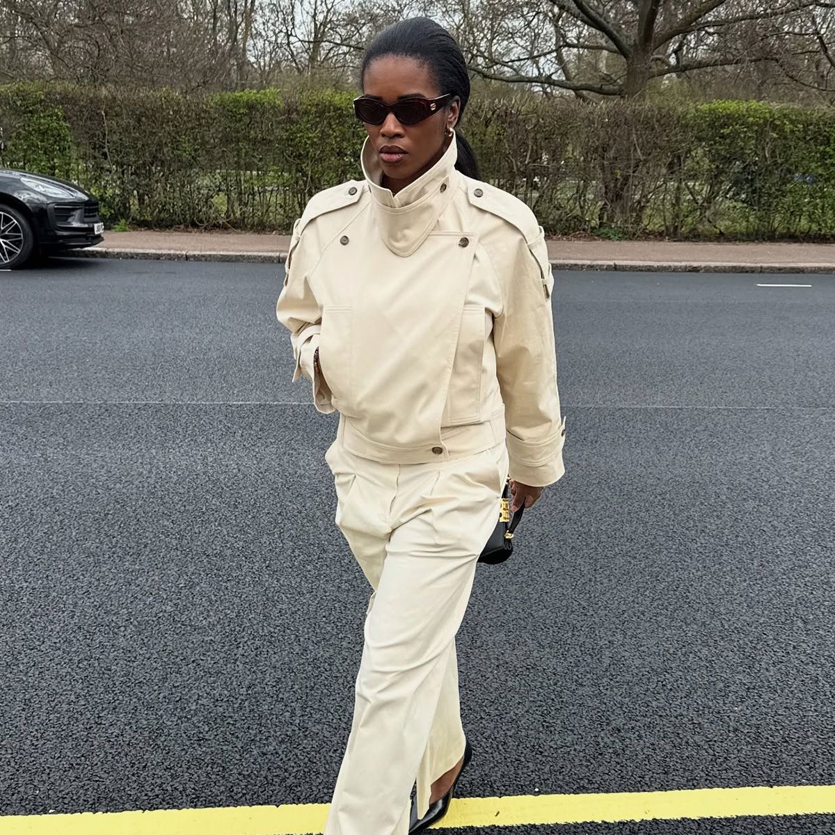 Marilyn wears a cropped trench coat and beige pants.