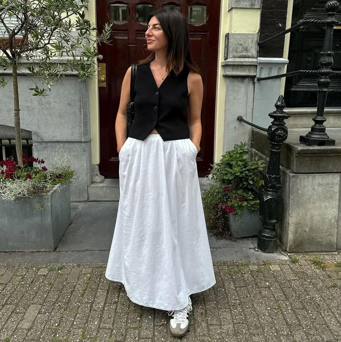 If you like the understated, minimalist look, you’ll want to opt for svelte silhouettes in muted tones, like the classic Converse or the much-loved Samba. If you want a slightly retro vibe that can dress down a skirt you worry looks too polished, pair your mini or slinky maxi with a chunky-soled style like the New Balance 550. Whatever your preference, I think I’ve found the six trainer styles that will go with almost any skirt. Happy shopping!