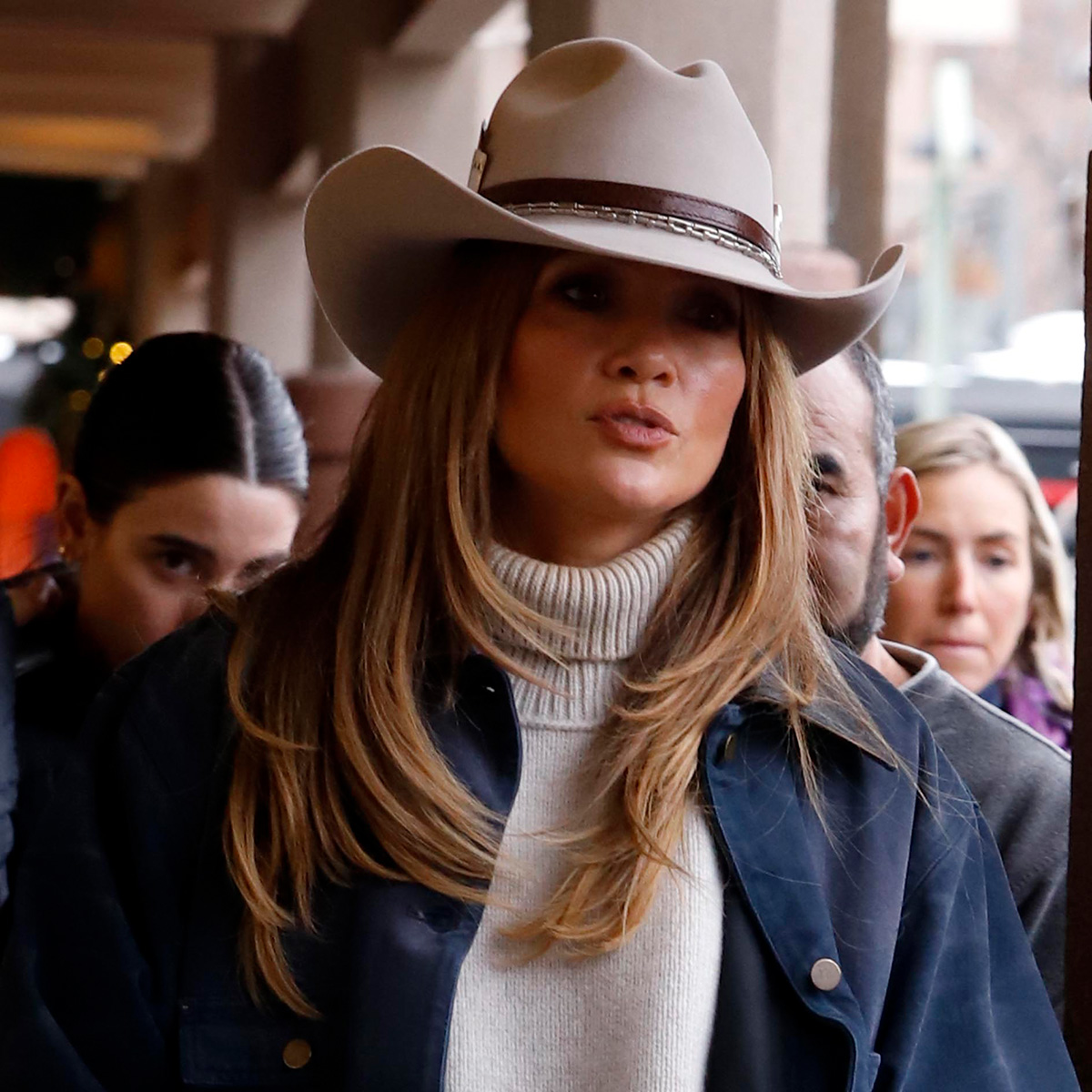For some roaming around Aspen’s downtown area, Lopez dressed prepared for the snowy elements in lug-sole Brunello Cucinelli boots, her new favorite pair of Free People barrel jeans, a turtleneck sweater, and a navy-blue barn coat, the outerwear trend that rose fashion’s ranks in 2024 only to hit its peak just in time for the New Year.
