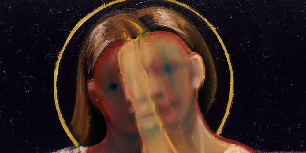 A sense of hollowness marks Lee’s paintings, though his compositions are anything but. In his “Three in One” works, several faces blur and bleed into one another atop ornately costumed bodies, while the floral maximalism of ‘Figure in a Garden’ exudes an anxious buzz